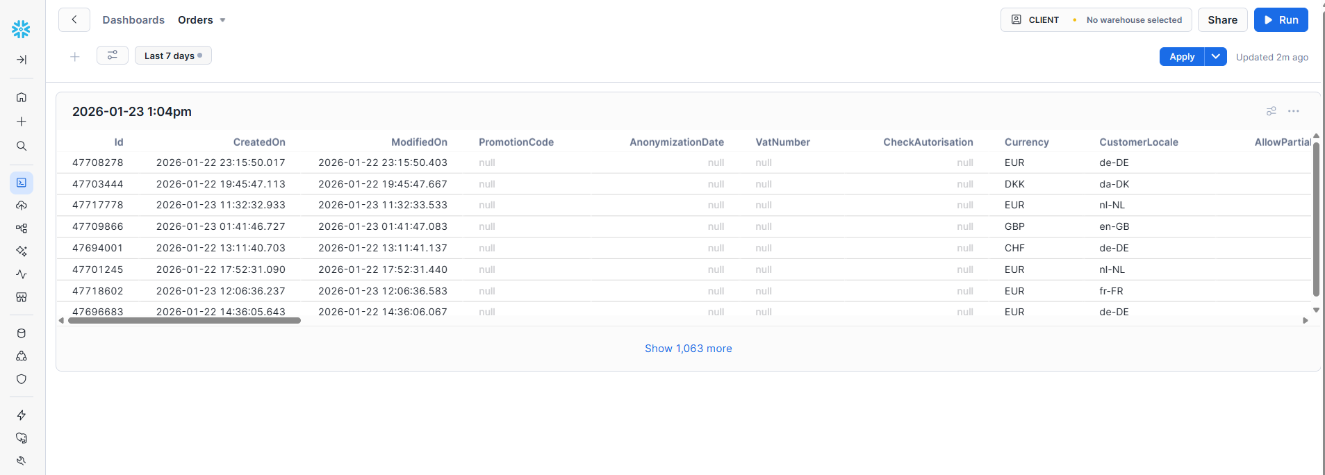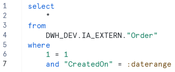 In the left bar you can select a database. For now: always use “DWH_DEV” as the database. Then select a schema. Clients only have access to the “IA_EXTERN” schema.