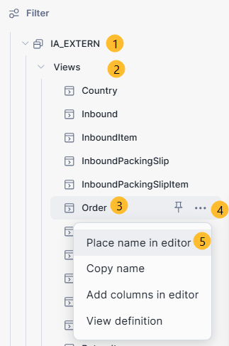 Under IA_Extern, select “views”, then the view “Order”. Click on the epsilon to get the menu, and then select "Place name in editor":