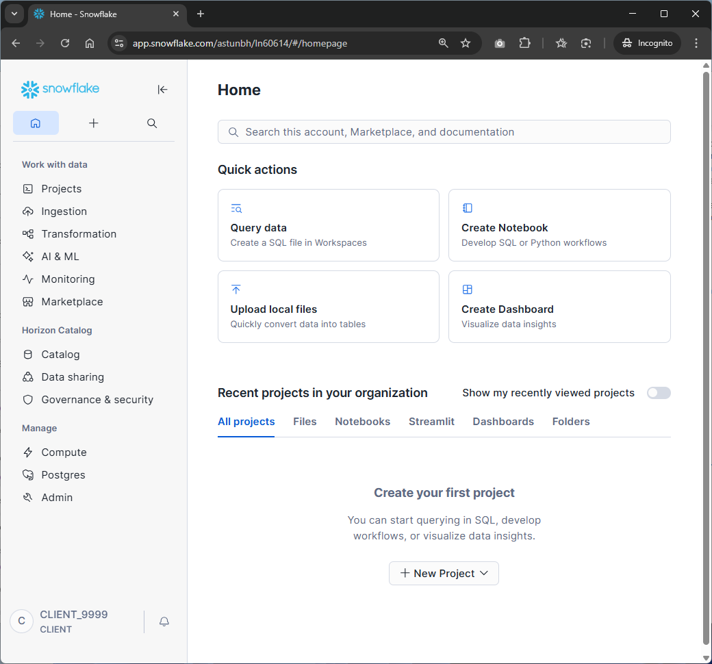 Once a user is logged in, the default Snowsight environment is shown: