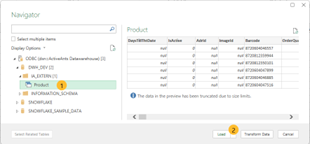 Open the database “DWH_DEV”, select the schema “IA_EXTERN”, and traverse down to Product. Select “Product” (1):