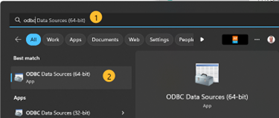 On your local machine: hit Windows-S, search for "ODBC Data Sources 64 bit" (1).